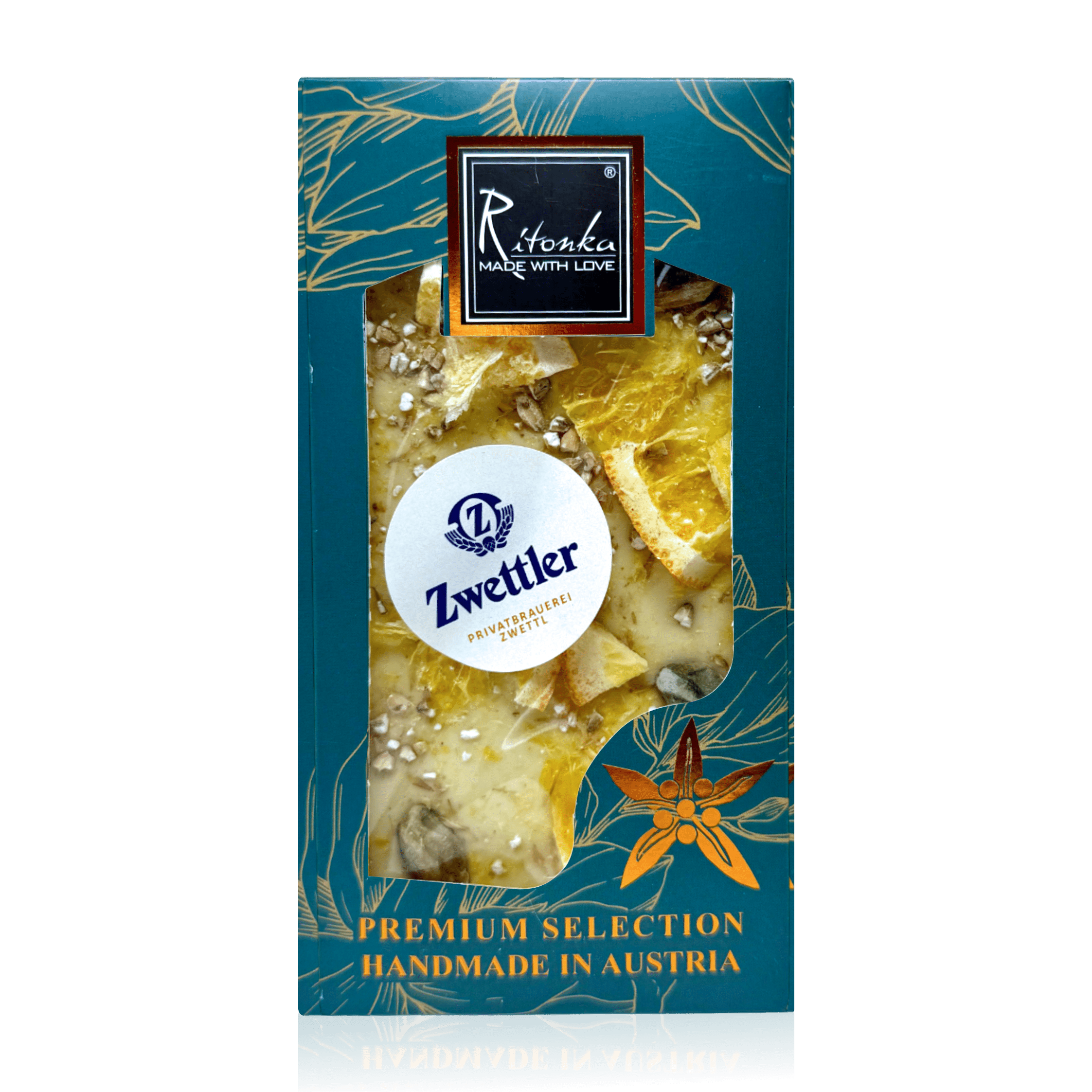 Premium weiße Schokolade mit Zwettler Braumalz, Orange & Pistazien